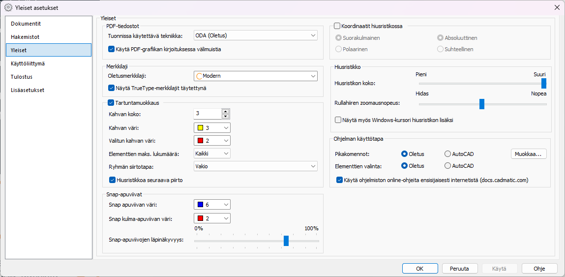 Yleiset-välilehdellä voit määritellä yleisiä ohjelman toimintaan, kuten tallennukseen ja fontteihin, vaikuttavia asetuksia.