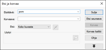 Merkintä-välilehti > Tekstit-ryhmä > Etsi ja korvaa, ETSIKORVAA