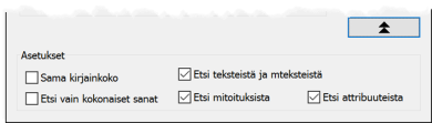 • Etsi vain kokonaiset sanat – Asetuksen ollessa käytössä, merkkijonoa etsitään ainoastaan kokonaisena. Esimerkiksi jos etsittävä sana pumppu, toiminto ei löydä merkkijonoa tekstistä uppopumppu.
