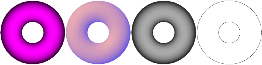 • Liukuvärit – Ohjelma varjostaa elementit pinnan normaalin ja valon suunnan mukaisesti. Ohjelma laskee jokaisen nurkkapisteen värin erikseen, eli värisävy voi vaihdella pinnalla.