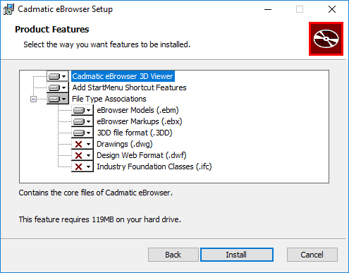 On the Product Features page you can select which of the following file type extensions to associate with eBrowser so that the files open in eBrowser by default: .3dd, .dwf, .dwg, .ebm, .ebx, .ifc.