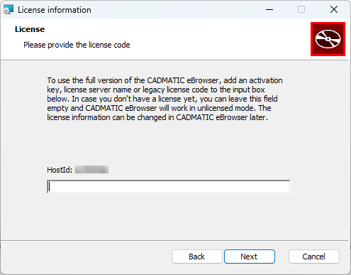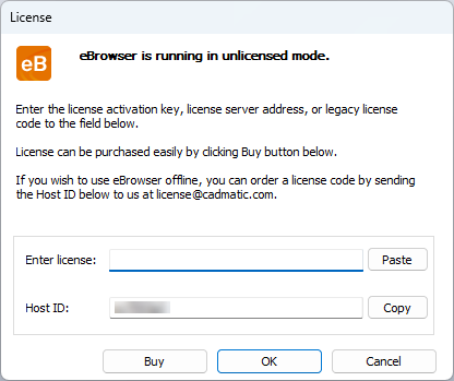 To use the full version of eBrowser, enter an activation key, license server name, or legacy license code to activate full version. If you do not have a license yet, leave the field empty and you can use eBrowser in unlicensed mode. You can update the license information later in eBrowser settings.