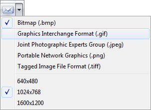 You can select the graphics file format and image size to use. The selections are saved in Windows Registry.