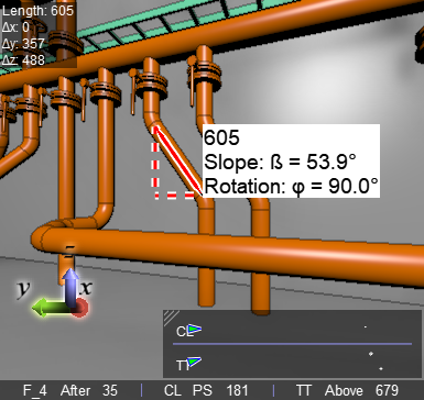 In this example, the slope angle between the pipe and the XY-plane is 53.9°, and the pipe is rotated from the X-axis by 90°.