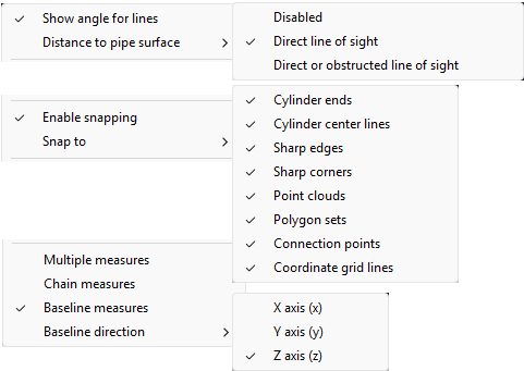 Distance to pipe surface — Opens a submenu for selecting whether measurements taken from pipe centerline should also show what is the distance from the surface of the pipe.