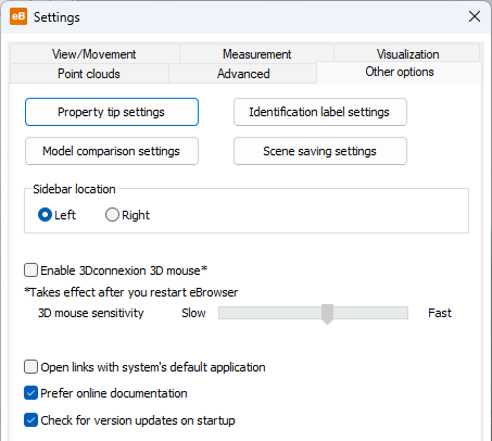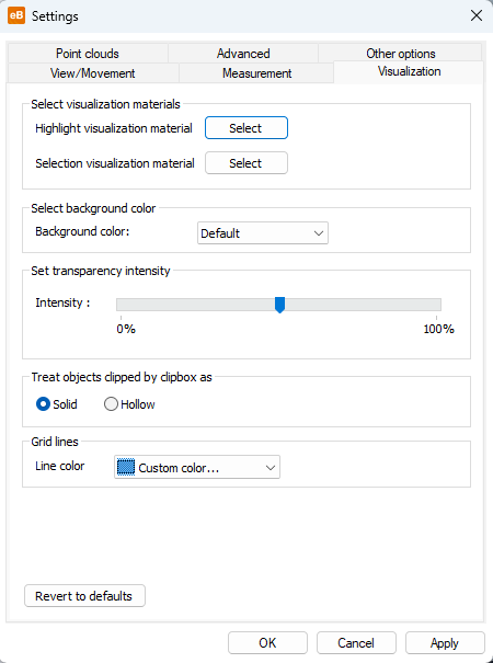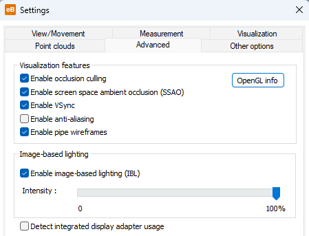 View/Movement | Measurement | Visualization | Point clouds | Advanced | Other options