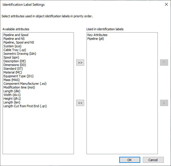 Move attributes from the left pane to the right pane to allow the attributes to be shown in object identification labels. The order of the items in the list defines their priority; each label shows the value of the attribute that is highest in this list, and if the object does not have any of the listed attributes the label is not displayed.