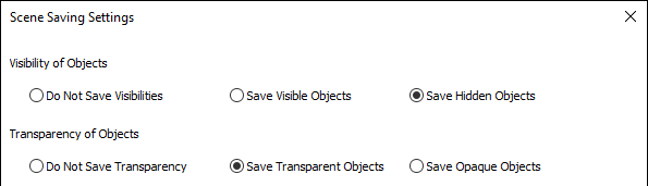 Scene saving settings – Opens the Scene Saving Settings dialog where you can define how the visibility of objects and transparency of objects is saved in scenes.
