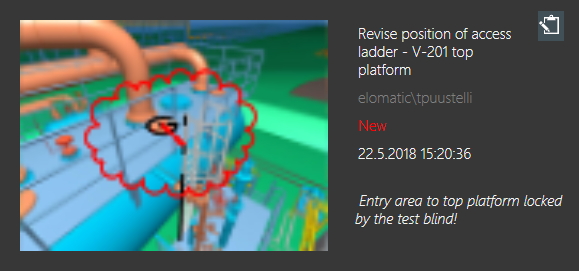 Selecting a markup tile sets the 3D view to the location of the markup, and the markup editor opens.