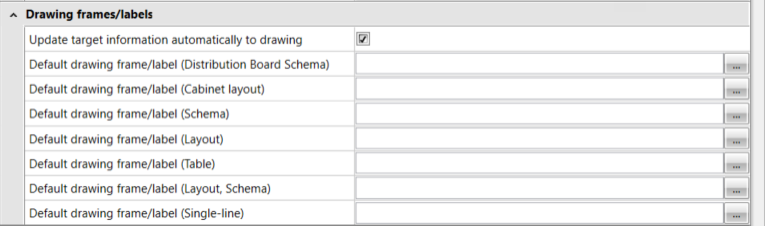 Default drawing frame/label – Define the default drawing frame/label for the desired document types. The value can be a full path to the symbol, a file name or a symbol name if the symbol is located in the symbol directory.