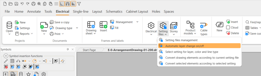 Electrical tab > Settings group >  Setting files menu > Automatic layer change on/off