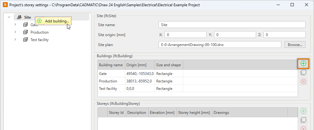 button next to the Buildings section. Alternatively, you can right-click the site in the tree and select Add building.