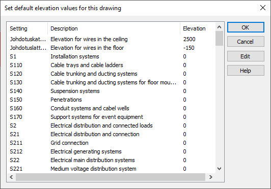 With this function, you can set default elevation values for certain systems in the drawing. These changes only affect objects that you place on the drawing after you have defined the default elevations. The changes do not affect the symbols which are already placed on the drawing. These changes affect only the open drawing, so you have to define the default values separately for other drawings.