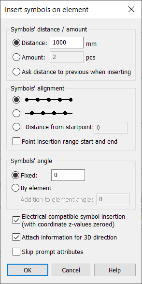 By element – Symbols will be added to angle equal to elements tangent angle in insertion point. With Addition to element angle, the given angle will be added to the angle determined by previous settings.