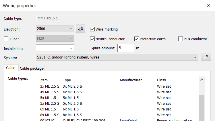 - Used in electrotechnical calculation – Is this cable part of electrotechnical calculations. In practice this means that cables cross-sectional area will be noted in calculations.