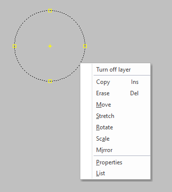 When you select an object, the program changes its lines into dashed lines and small boxes appear on the object. These boxes are called handles, and they show you the control points of the object. You can edit the selected objects by moving these boxes, such as selecting the centerpoint of a circle to move it or selecting a handle on the circumference of a circle to change its radius.