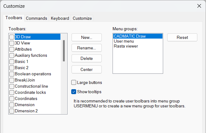Important: You should not add user toolbars to the CADMATIC Draw menu group as that will be overwritten in the next update. Always select the User menu group.