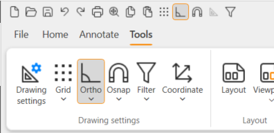 Tools tab > Drawing settings group > Ortho, ORTHO |