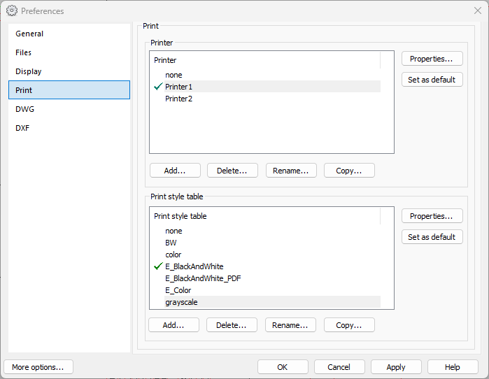 You can add multiple printer configurations for one Windows printer. This makes it possible to create configurations that use different default settings i.e. different scales or print styles. You can easily create new configurations for the same printer by clicking Copy, and then changing the desired settings.