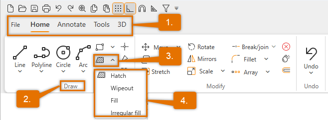 In CADMATIC Draw, most of the functions and tools are provided in a ribbon located to the top of the application window. The ribbon consists of tabs for all the main functions, and the tabs, in turn, consist of logical groups for the various functions and tools.