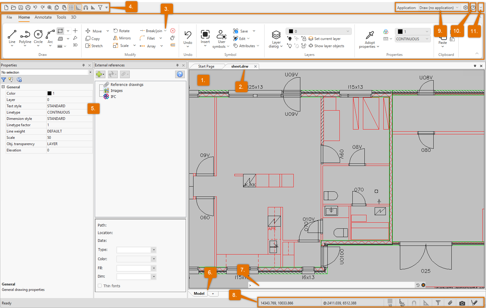 CADMATIC Draw’s user interface consists of the basic elements represented in the following image: