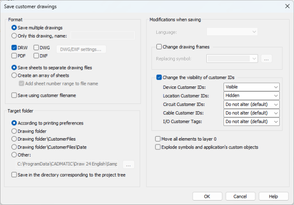 • Change the visibility of customer IDs – If alternative customer IDs have been defined in Electrical DB, you can change them when saving drawings.