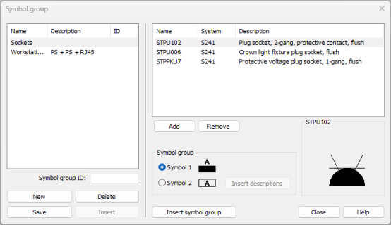 With this function, you can create and insert symbol groups that represent one or several symbols – for example, you can create a symbol group of plug socket symbols. Symbol groups contain information about the symbols, such as symbol names, systems and the drawing-specific ID of the symbol group.