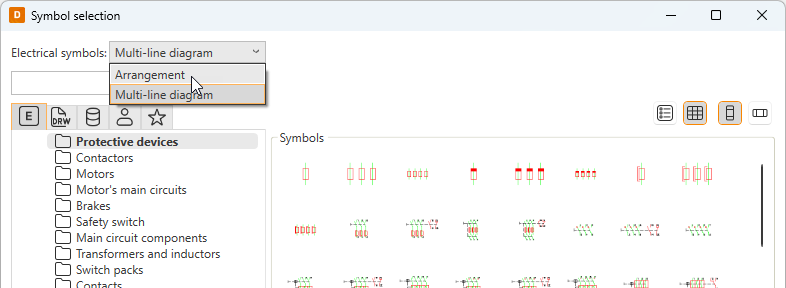 - Select from menu – Select the symbol in the Symbol selection dialog (see Symbol selection). By default, the symbols are shown based on the drawing type but you can select another drawing type (multi-line diagram or arrangement drawing) from the drop-down menu.