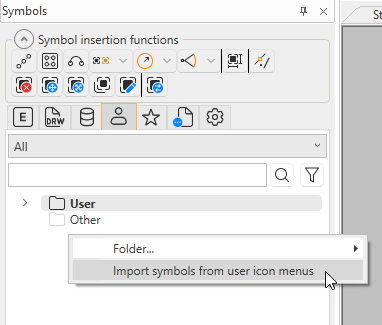 You can save and insert your own symbols via the (User's symbols) tab. The symbols you create and save with the Save user symbol function are available on this tab, in addition to which you can import your previously created symbols from the icon menus to the Symbols window by right-clicking in the field and selecting Import symbols from user icon menus: