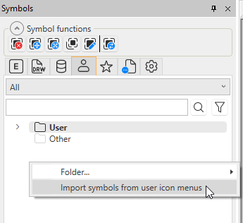 (User's symbols) tab. The symbols you create and save with the Save user symbol function are available on this tab, in addition to which you can import your previously created symbols from the icon menus to the Symbols window by right-clicking in the field and selecting Import symbols from user icon menus: