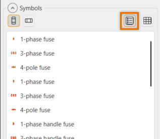 Settings – You can select another drawing type whose symbols you want to show in the dialog temporarily. In an arrangement drawing, for example, you can select to show multi-line symbols. This setting will be valid for as long as you have the Symbols window open. Once you close the window and open it again, symbols will again be shown based on the current drawing type. |