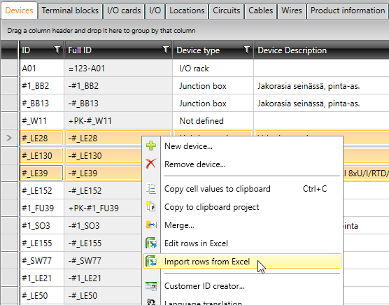 With the Edit rows in Excel function, you can edit project information in an Excel file and then import the new values to Electrical DB Tool.