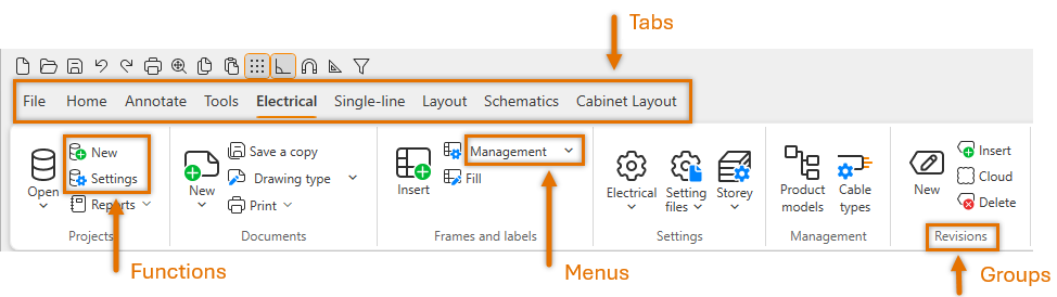 On the Electrical tab, you have access to general functions such as starting new drawings and defining settings. With Ctrl + D, you can easily move between the Electrical tab and the tab related to the active drawing (Schematics, for example).
