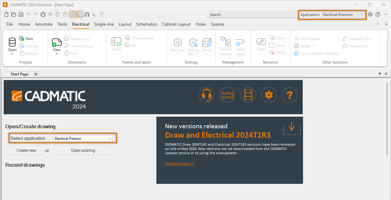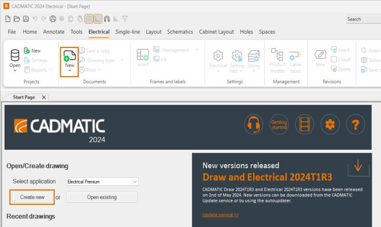 On the Start Page, click Create new to start a new drawing. Alternatively, click New on the Electrical tab.