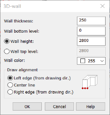 Set wall thickness, wall bottom level, wall height or wall top level and drawing color of the wall.