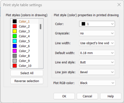 In the Print style table section, click Properties. Select the drawing color to edit, and define the settings: