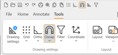 Select Tools tab > Drawing settings group > Drawing settings > Object snap tab or double-click the grid icon in the lower right corner of the screen. The Drawing settings dialog opens.