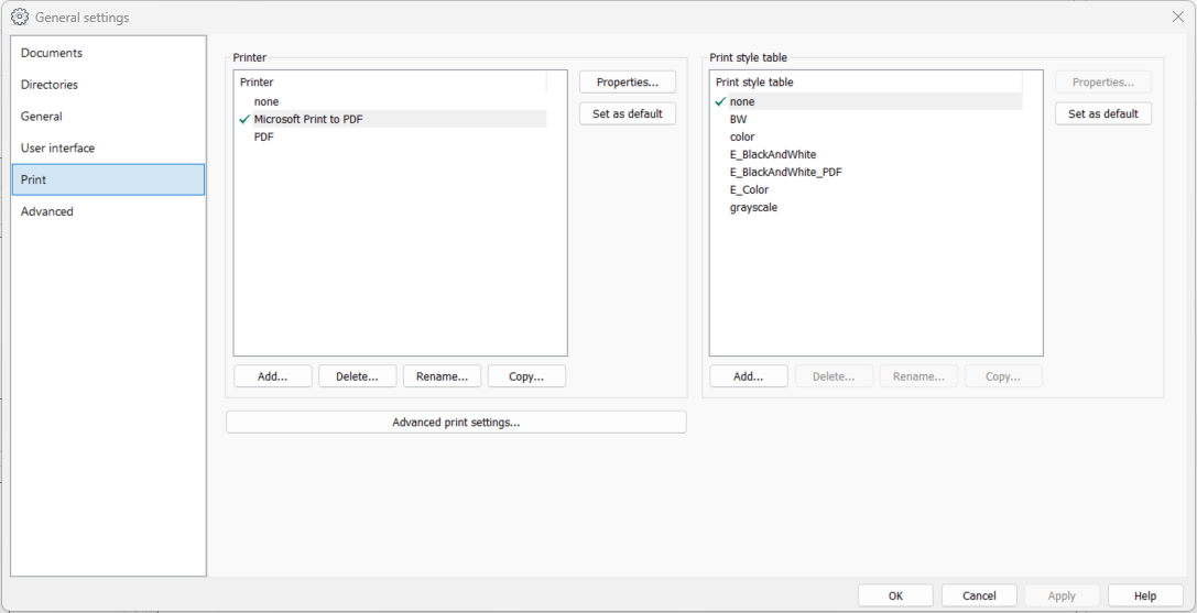 Print styles have default settings (colors, widths, etc.) that are used when selecting the print style into use.