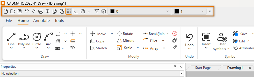 The quick access toolbar includes shortcuts to frequently used functions, such as opening and saving drawings and undoing and redoing previous actions.