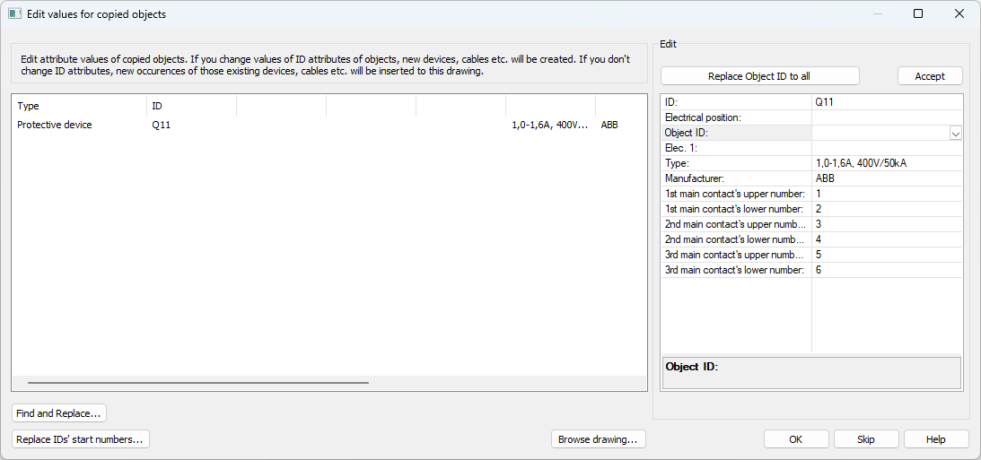 Replace IDs' start numbers – With this function, you can replace the start numbers (e.g. 1K1 > 2K1) for ID attributes, for example. This function is useful after copying sheets, when you only want to replace the start number part in an ID. This function is also available in the Find and replace function.