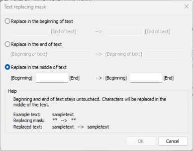 Find and Replace – Clicking the button opens the Text replacing mask dialog where you can find and replace attribute values from all rows. You can replace value text from the beginning, end or middle.