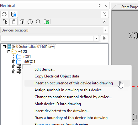 In the project tree, right-click the device you want to insert in the drawing, and select Insert occurrence of device to drawing.