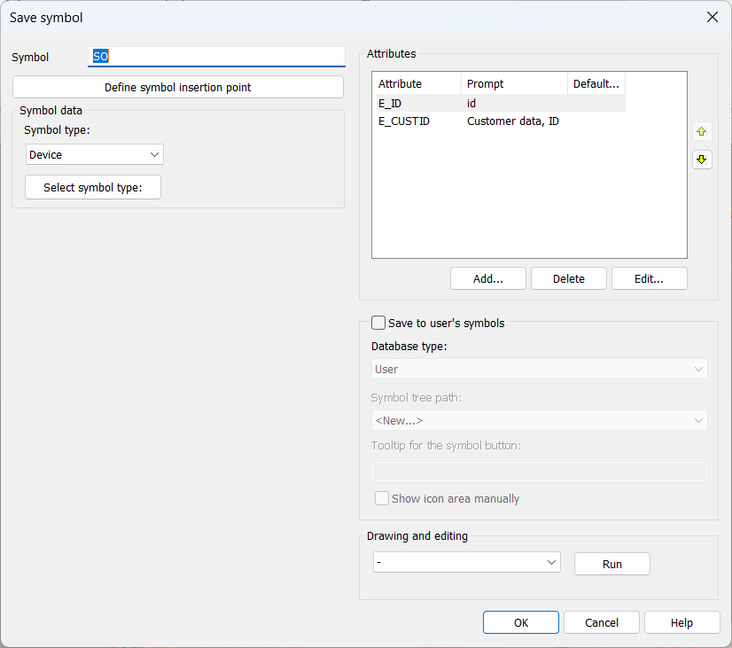 - Attributes – Every symbol needs at least the E_ID attribute (ID). Add an attribute by clicking Add, selecting the attribute and inserting the default value if needed. Then indicate attribute's insertion point.