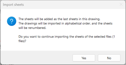 With this function, you can import all sheets from the selected drawing files to the current drawing. The sheets are added after the existing sheets, and all the drawing sheets will be renumbered consecutively.