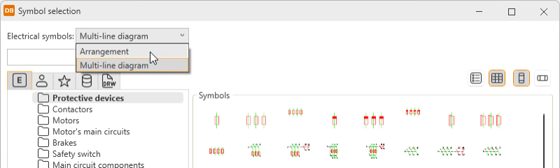 - Select from menu – Select the symbol in the Symbol selection dialog (see Symbol selection). By default, the symbols are shown based on the drawing type but you can select another drawing type (multi-line diagram or arrangement drawing) from the drop-down menu.