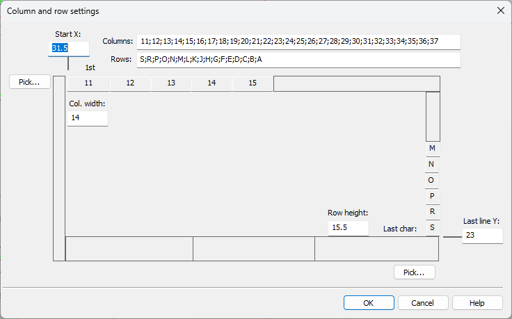 Select the frame in the drawing. The Column and row settings dialog opens.