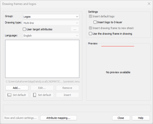 You can have several logos, but you can only define one logo as the default. The program inserts the default logo automatically on drawing labels and frames if you select Insert default logo. You can use the same logo for labels and frames, as it will be scaled to fit the logo position as necessary.