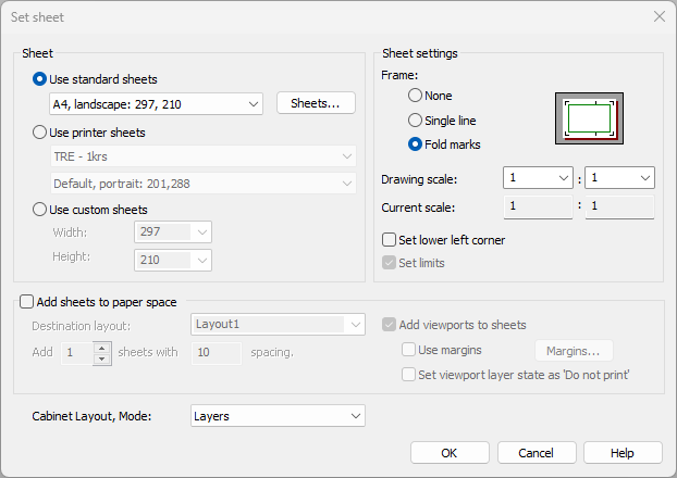 If you selected Cabinet layout, the Set sheet dialog opens.