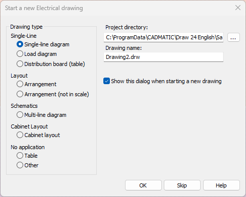 If the Show "Start a new Electrical drawing" dialog when starting a new drawing has been enabled in the general settings, the Start a new Electrical drawing dialog opens. When creating a new drawing using this guided function, you can be sure that all the necessary settings are correct. Furthermore, when you open a drawing with drawing type defined, the correct ribbon tab with suitable functions and symbols will automatically open. Also see Set drawing types.