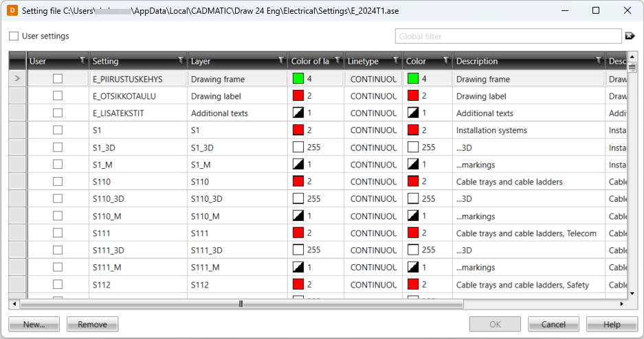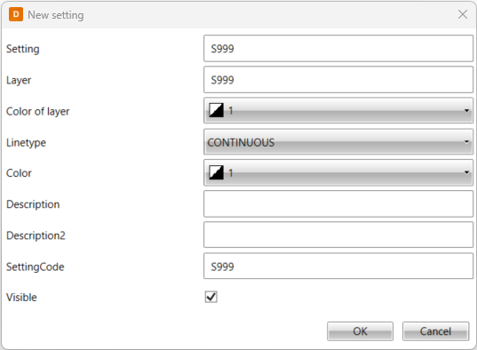 The name of the setting and its layer, colors, line type and descriptions are shown in the grid. The first column (uneditable) indicates whether the setting is created by you or one of the application's default settings. The Visible setting determines whether the setting is visible in the selection dialog or not.
